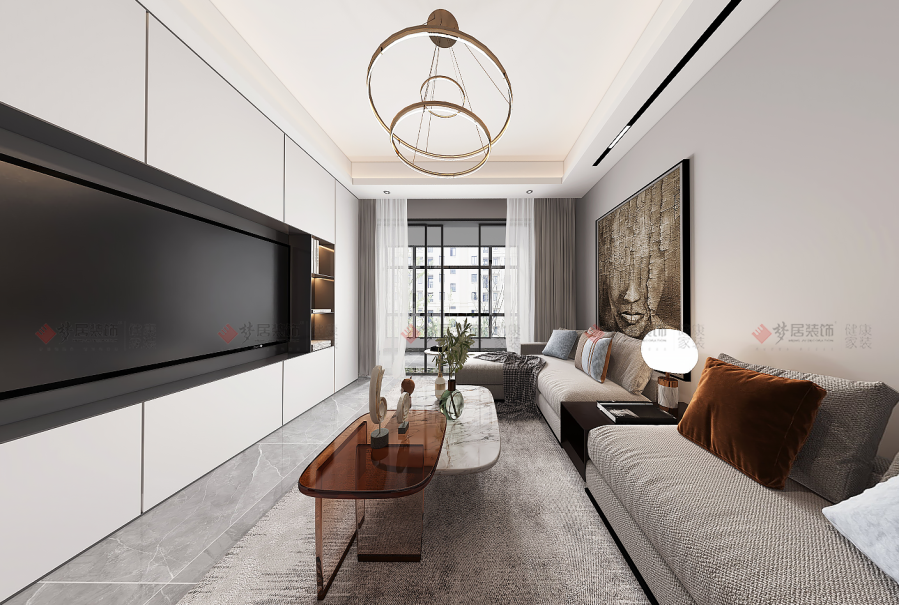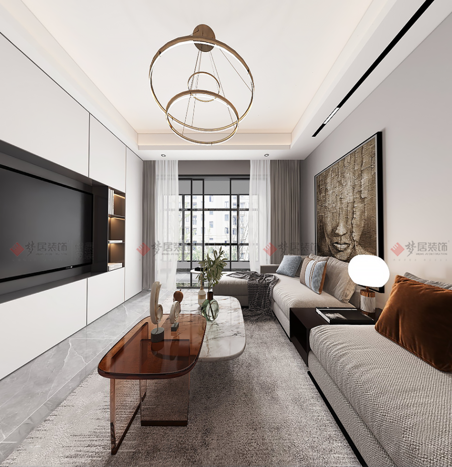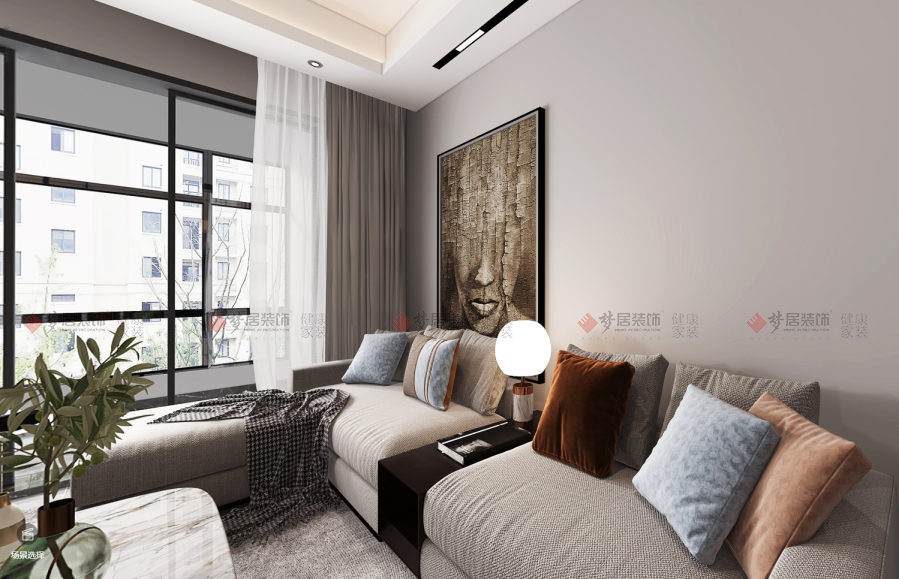 | 設(shè)計說明:現(xiàn)代簡約風(fēng)格強調(diào)功能性設(shè)計,設(shè)計線條簡約流暢,空間色彩和諧舒適,以簡潔的造型、完美的細節(jié),營造出時尚前衛(wèi)的感覺。以質(zhì)感高級的淺灰色系為主,局部點綴金色、茶色,形成前衛(wèi)雅致的格調(diào)。布藝沙發(fā)柔軟舒適,絲絨質(zhì)感的抱枕為空間增加時尚華麗的效果。藝術(shù)掛畫打造時尚氛圍,彰顯個性。搭配綠植使居室愜意,輕松。電視背景墻為整排收納柜滿足收納所需,電視內(nèi)嵌讓視覺更整體。使用玻、不銹鋼等新型材料作為輔材,給人的感覺前衛(wèi)大氣。極具現(xiàn)代感的造型燈和家具美觀與實用并存,金屬獨特的光澤使家具倍感時尚。高純度色彩掛畫打破空間的平緩,紅橙色的使用大膽而出彩??臻g結(jié)構(gòu)明確美觀,富有生活氣息。 | |||
