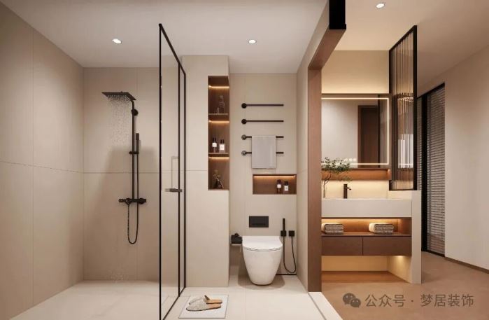 衛(wèi)生間洗手臺(tái)外置,長虹玻璃做隔離,明亮又通透。衛(wèi)浴空間干濕分離設(shè)計(jì),方便清潔和使用。壁龕將洗護(hù)用品一一收納,空間干凈整潔,更舒適便捷,整體好看又實(shí)用