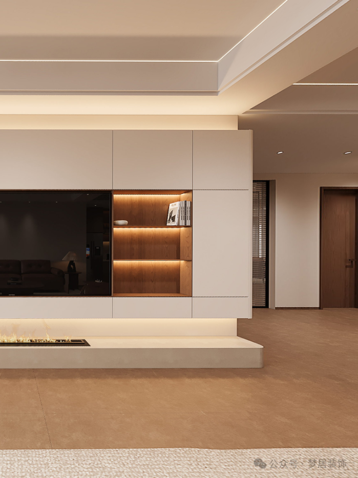 電視墻設(shè)計(jì)以杏色為主,搭配胡桃木色作為跳色,與通鋪公區(qū)的淺棕色柔光磚形成呼應(yīng)。仿佛在時(shí)光中的一座溫馨島嶼,讓繁雜的思緒得以沉淀。