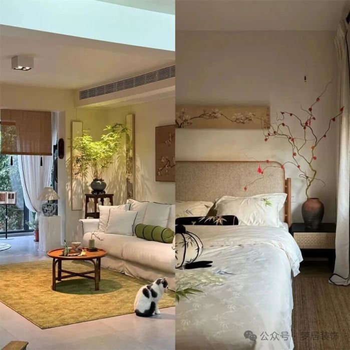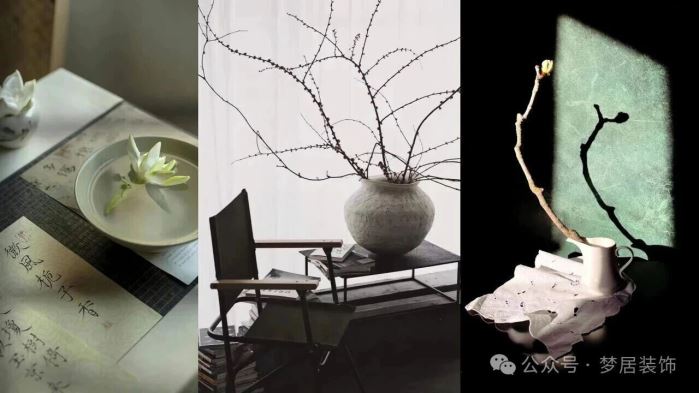 材質(zhì):講究自然肌理和啞光質(zhì)感,多用原木(榆木、白蠟木)、宣紙肌理、素麻、亞光瓷、細密麻布