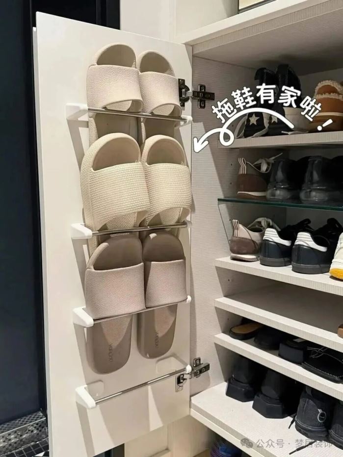鞋柜深度可以做到40cm,將層板內(nèi)縮10cm,柜門掛架放置拖鞋,也能擴容,并且完全不影響柜門開關(guān)。