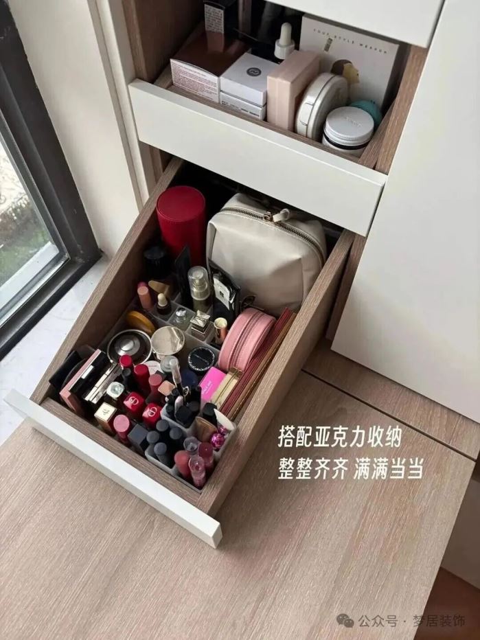不同高度的化妝品按高矮碼好,所有東西清清楚楚擺在眼前,拉開抽屜拿取巨方便,用完又隨手歸位,桌面瞬間清爽。