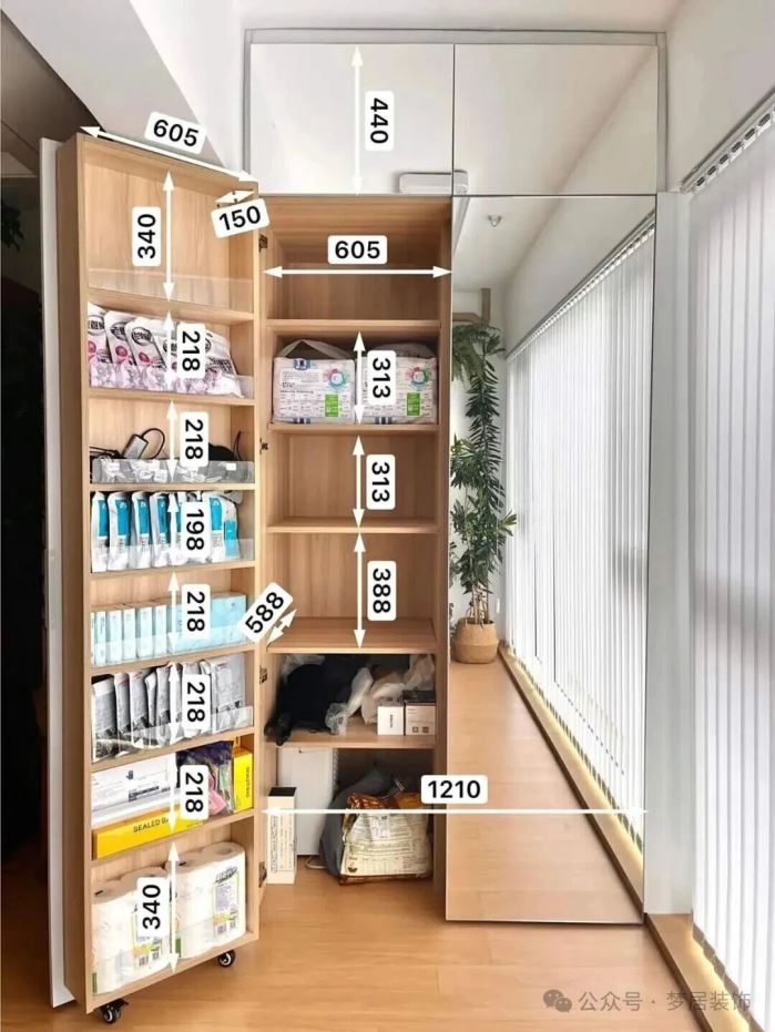 裝修常規(guī)柜子最深也就60cm,有些戶型有條件,70-80cm的進深空間可以做一個超實用的冰箱式收納柜。