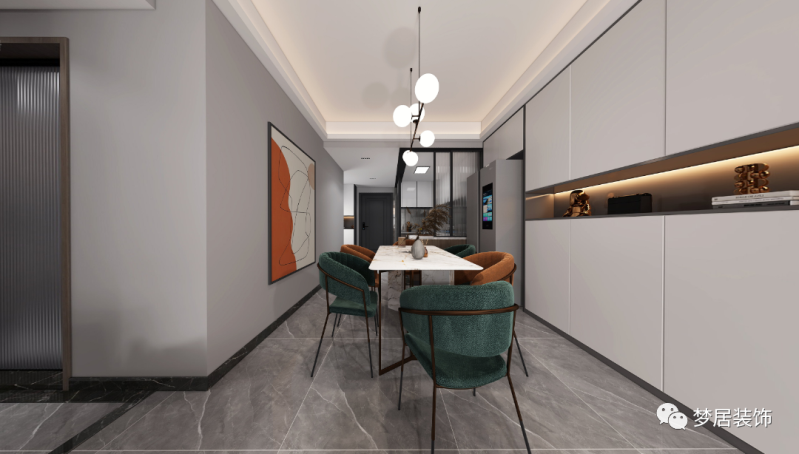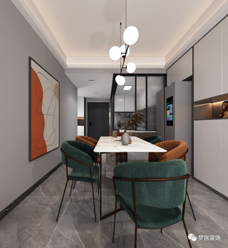 極具現(xiàn)代感的造型燈和家具美觀與實用并存,金屬獨特的光澤使家具倍感時尚。高純度色彩掛畫打破空間的平緩,紅橙色的使用大膽而出彩。半開放式廚房使空間更通透明亮。
