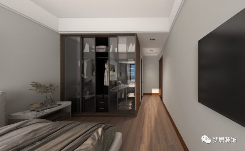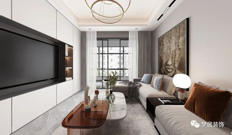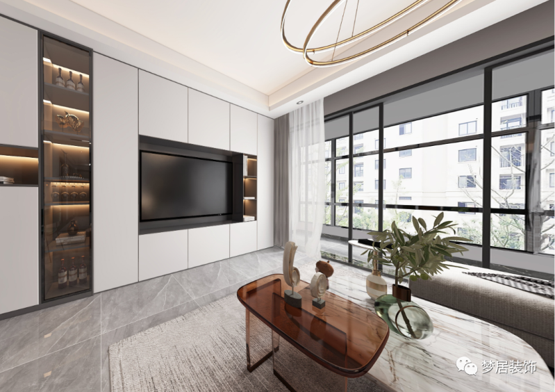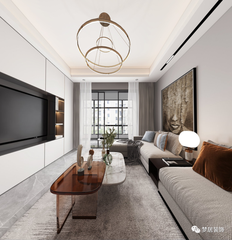 現(xiàn)代簡約設(shè)計風格追求自由,室內(nèi)空間開敞通透。電視背景墻為整排收納柜滿足收納所需,電視內(nèi)嵌讓視覺更整體。使用玻璃、不銹鋼等新型材料作為輔材,給人的感覺前衛(wèi)大氣。