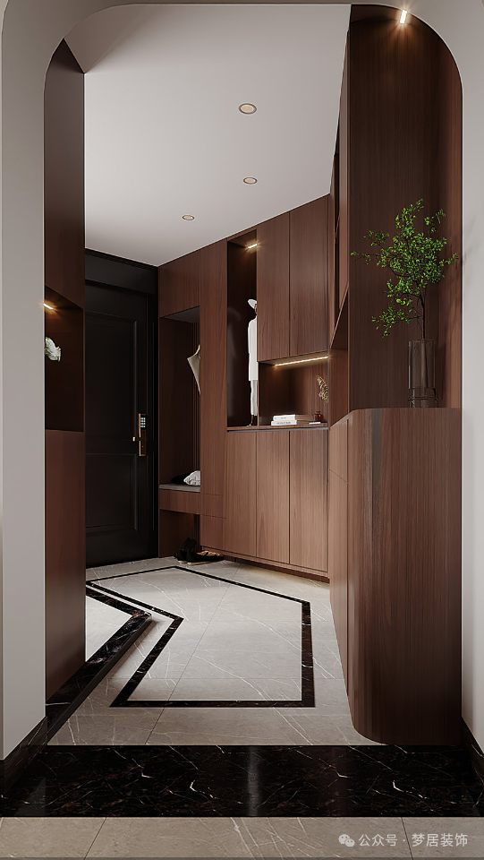 玄關(guān)與大廳之間形成一個自然的轉(zhuǎn)折,保持室內(nèi)的私密性,搭配實木玄關(guān)柜,方便日常穿鞋拿取,入戶空間寬敞,實現(xiàn)大柜體的收納,讓歸家更加舒適妥帖。