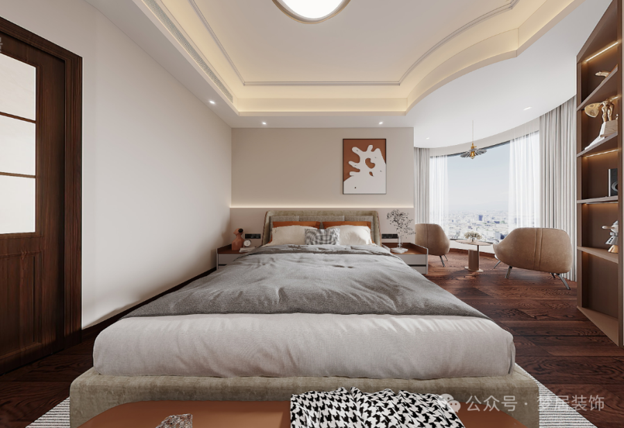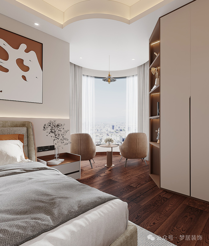 主臥顏色選用淺杏色進(jìn)行搭配,燈光作為點綴,舒適而靜謐,生活溫馨且舒適。褪去一身的繁華在椅子上看書休息,看著窗外城市的夜景好不愜意。