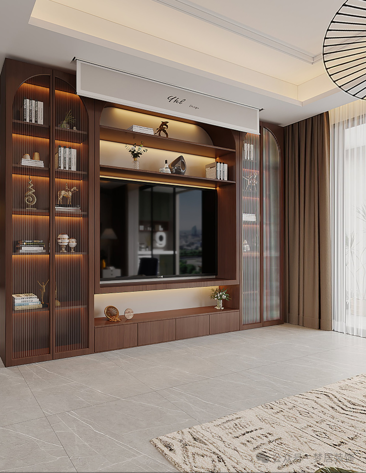 電視墻做成了大面積的儲物柜,同時增加了可以升降的投影幕布,增加收納空間的同時更有了多元的觀影體驗。