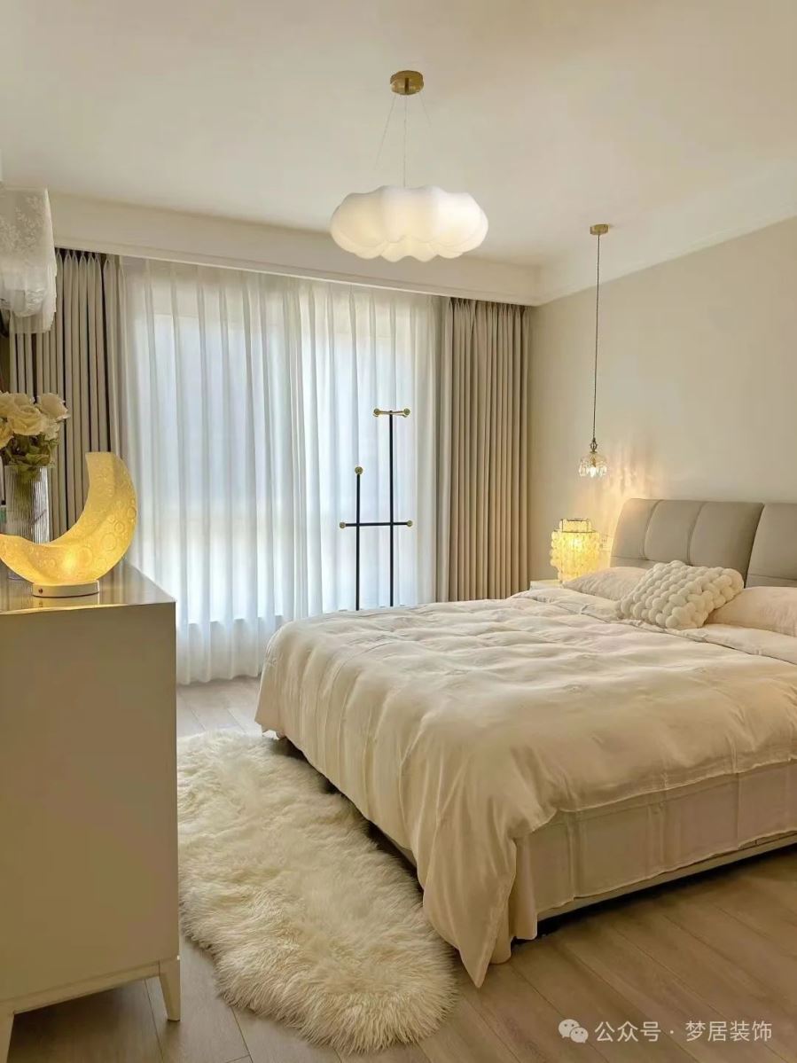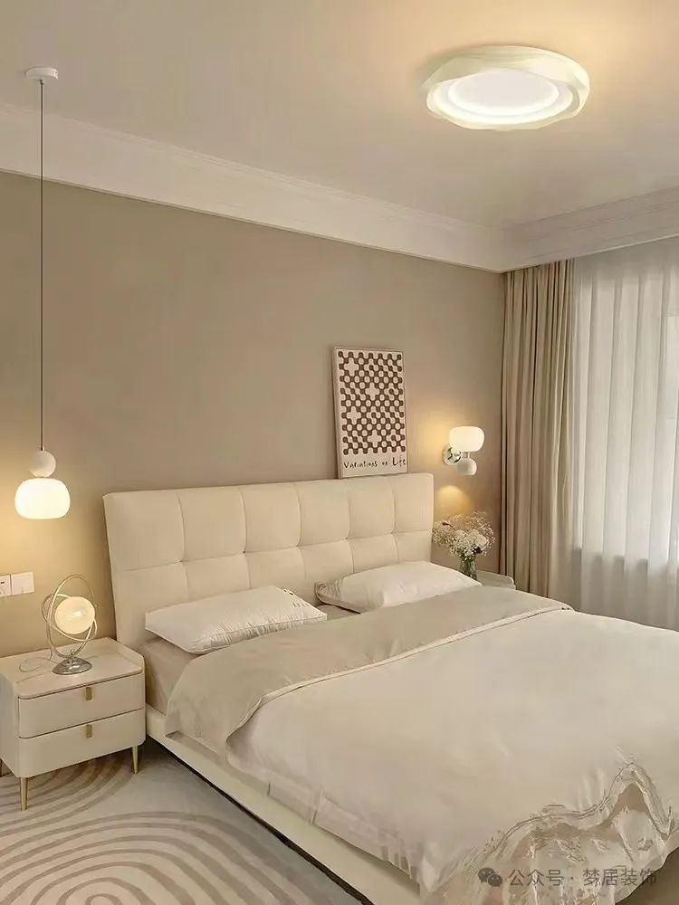 建議:盡量保持床正上方的空間空曠干凈,安裝燈具可以選擇吸頂燈,簡(jiǎn)約大方;或者采用無(wú)主燈設(shè)計(jì),搭配床頭小吊燈,會(huì)更有氛圍感;如果要選擇吊燈盡量選擇輕盈一些的裝飾燈。