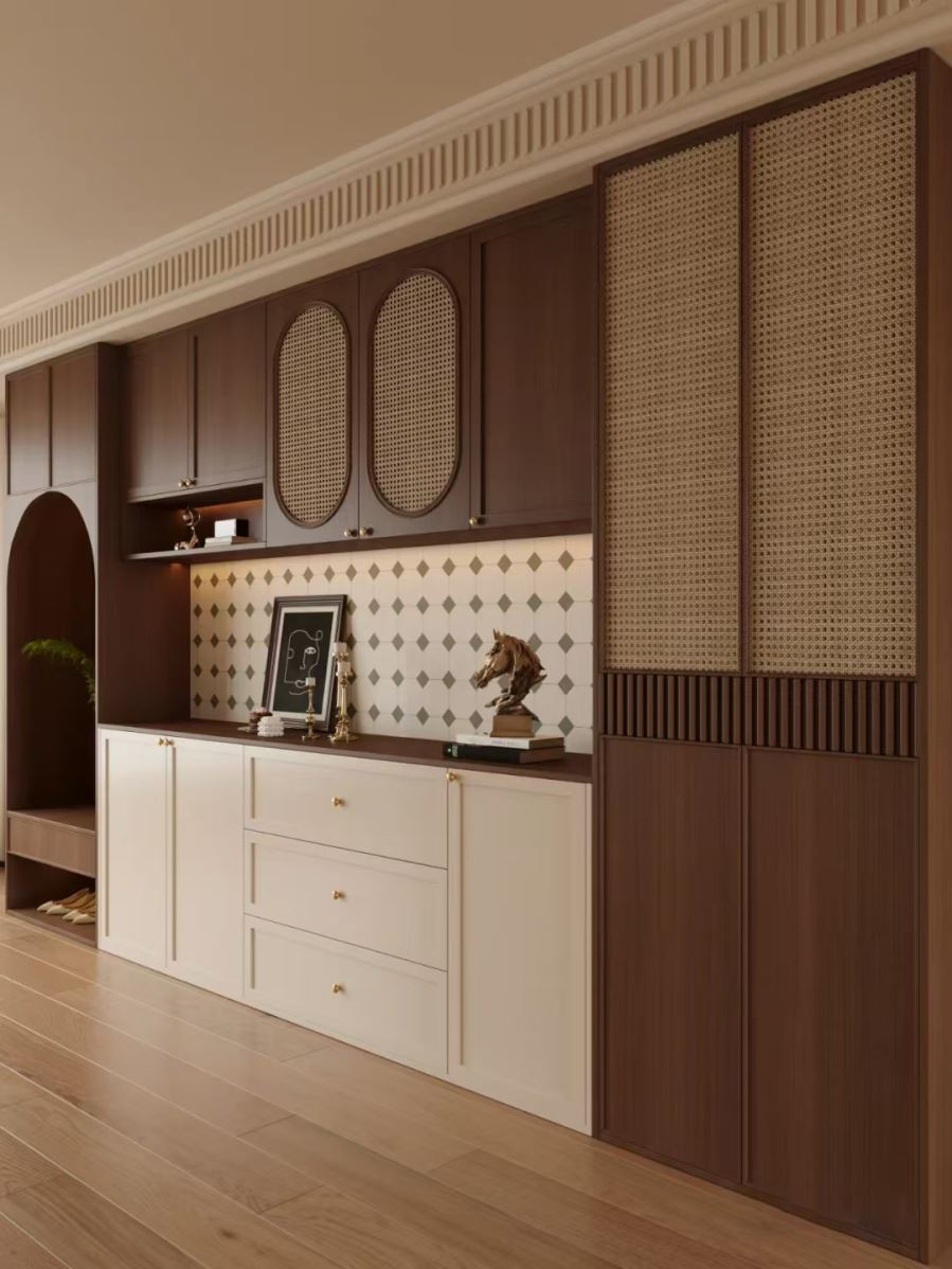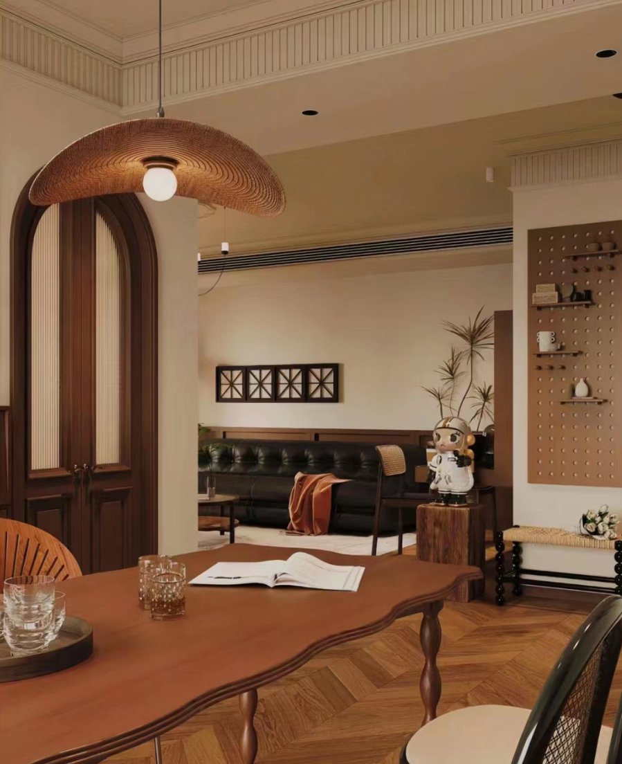 除此以外,在一些軟裝配置和家具上還會采用藤編、麻布等自然質(zhì)感的材料,營造出復(fù)古懷舊的質(zhì)感。