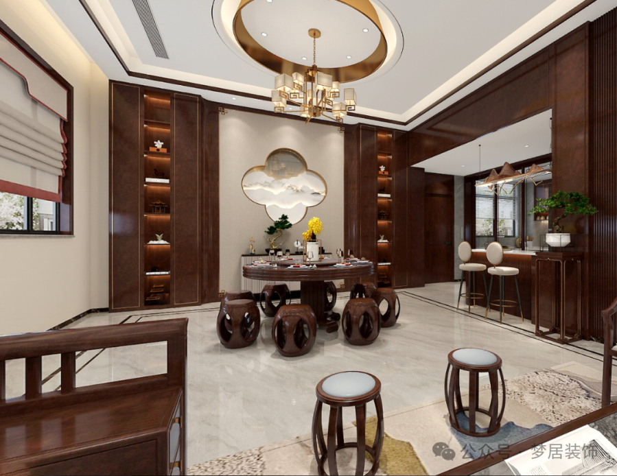 新中式客廳為對稱式布局,高闊寬敞,典雅大氣,選用造型簡樸優(yōu)美的中式家具,格調(diào)高雅。