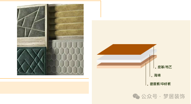硬包是利用木工板或者密度板根據(jù)需要在墻面上做成各種造型,之后將邊緣做成直角或者45°的斜邊,最后使用皮革或布藝來做飾面包裝。