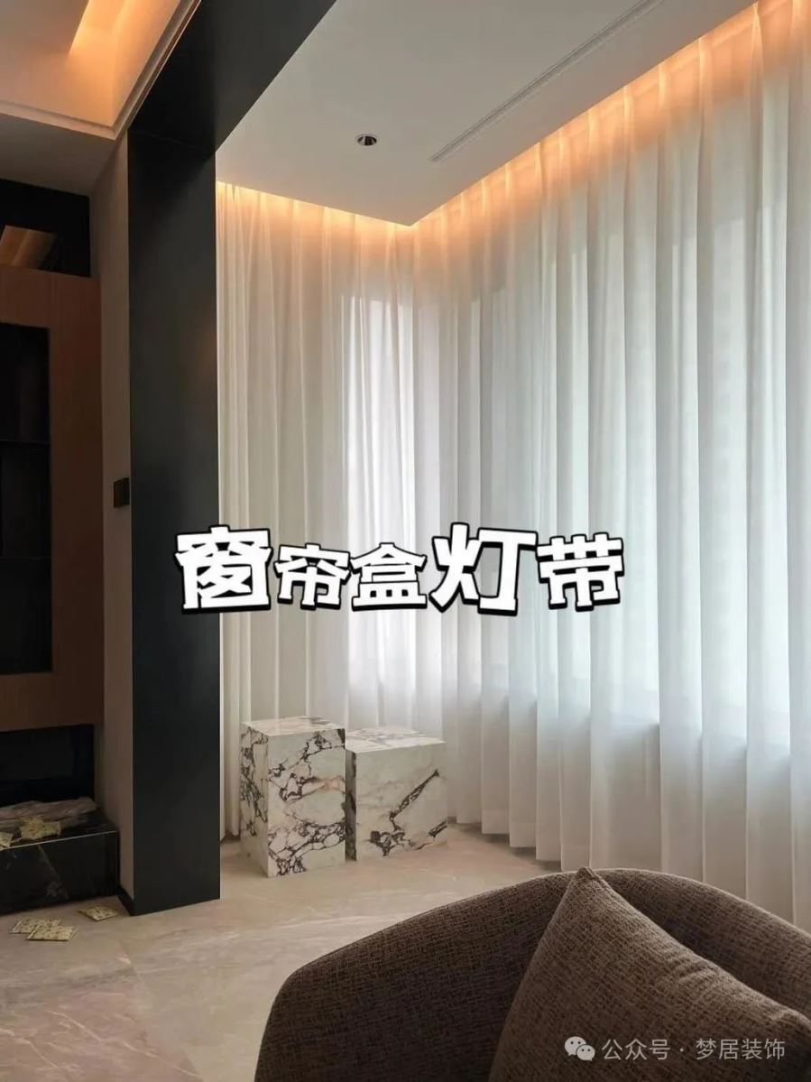 在臥室的窗簾盒里面加一條燈帶,氛圍感立刻就不一樣了,燈光照射在紗簾上,柔和浪漫,有層次感。