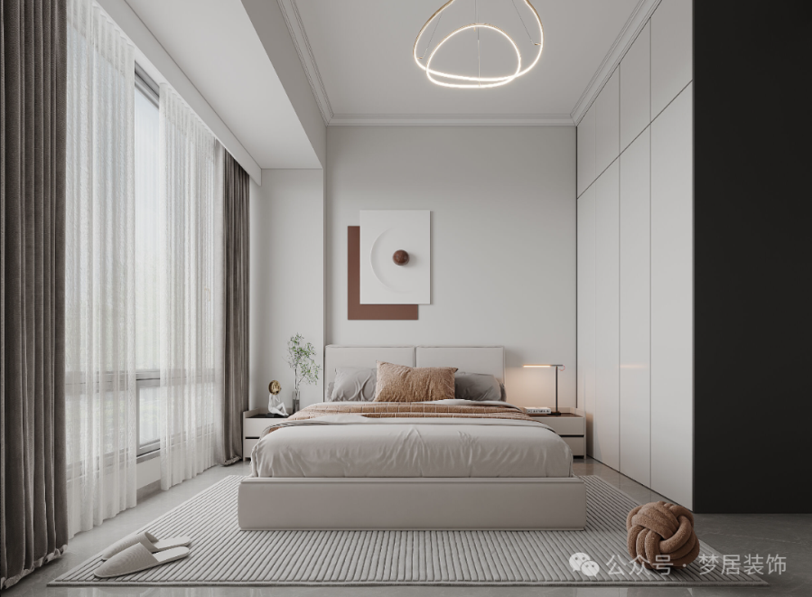 主臥打造大衣柜,四季衣物輕松裝下。同色系的柜門降低了衣柜的存在感和擁堵感,房間更顯寬敞。床頭搭配氛圍燈,淺灰色的地毯營(yíng)造臥室空間的溫暖松弛感。