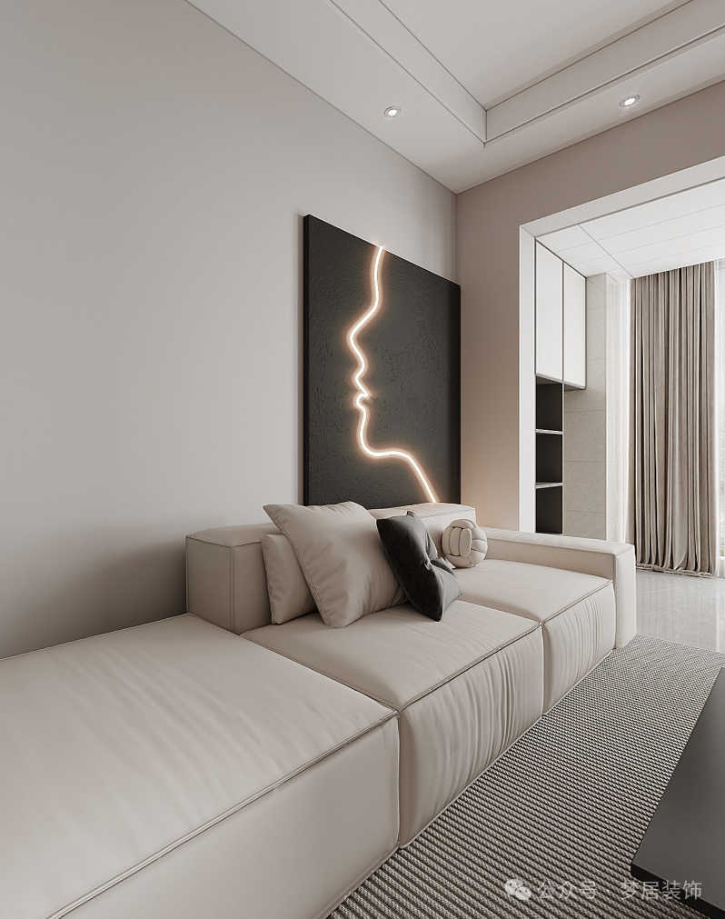 柔軟的布藝沙發(fā)舒適度滿分,極簡(jiǎn)留白的墻面搭配現(xiàn)代藝術(shù)畫作,一切看上去簡(jiǎn)約隨性,但所顯露的高級(jí)感怎么也看不膩。