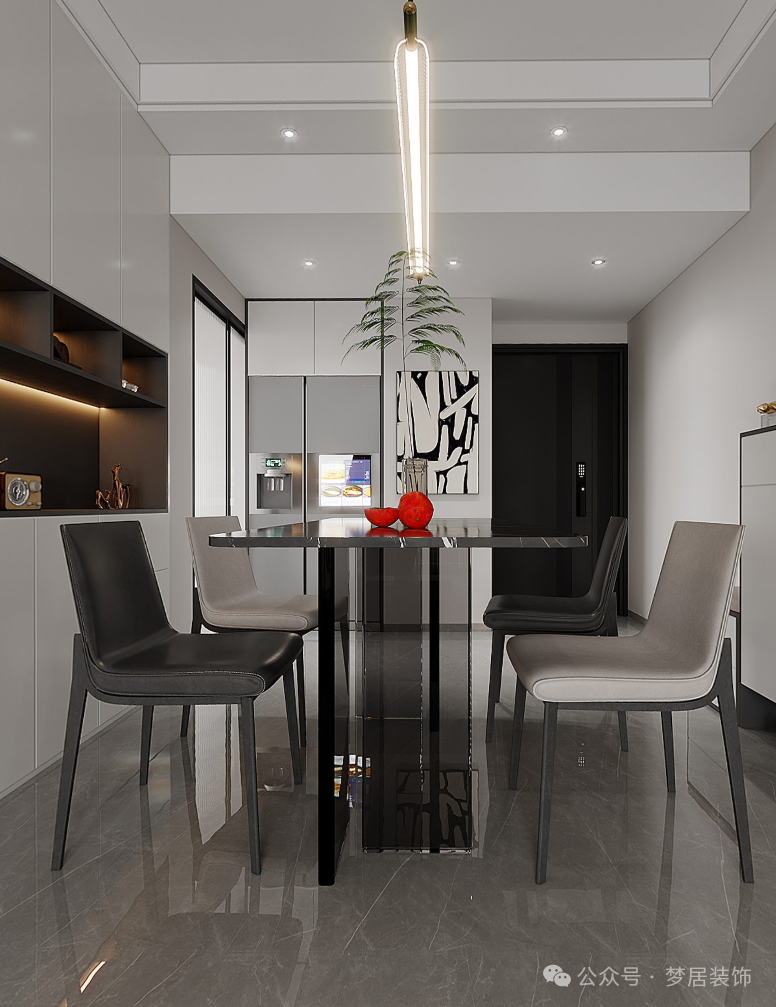 餐桌上方裝了吊燈,單獨(dú)增加重點(diǎn)照明,用餐更有氛圍感?,F(xiàn)代設(shè)計(jì)感餐桌簡(jiǎn)約時(shí)尚,餐椅在餐后可以收入桌下不占空間。