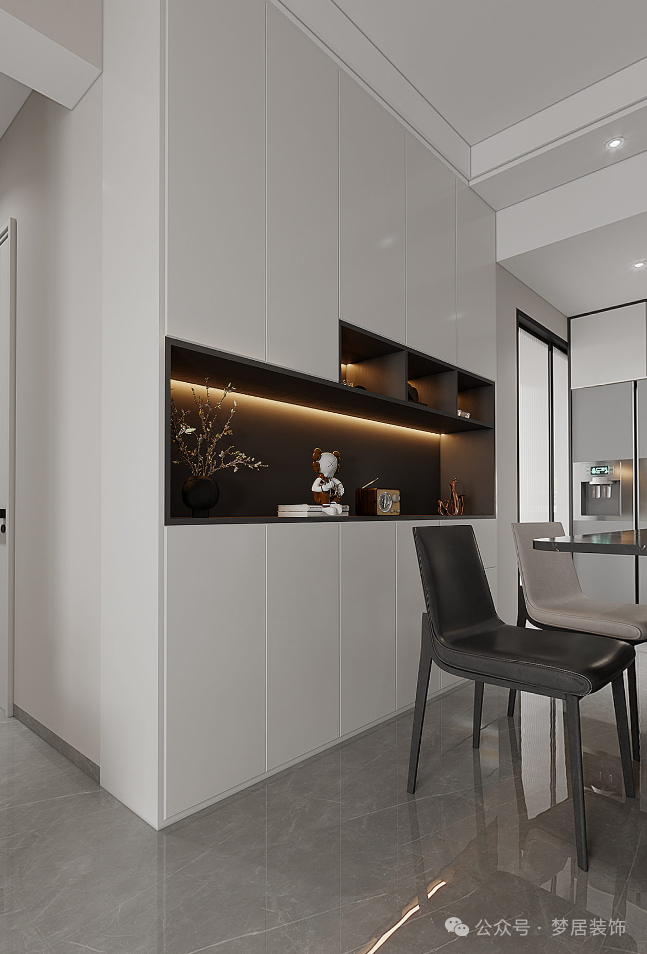 餐邊柜增加收納,設(shè)計(jì)與餐廳整體風(fēng)格協(xié)調(diào)。平時(shí)存儲(chǔ)餐具、酒具等物品。開放格增加多樣化收納功能,放置常用小物品或作為展示區(qū)放置裝飾品。
