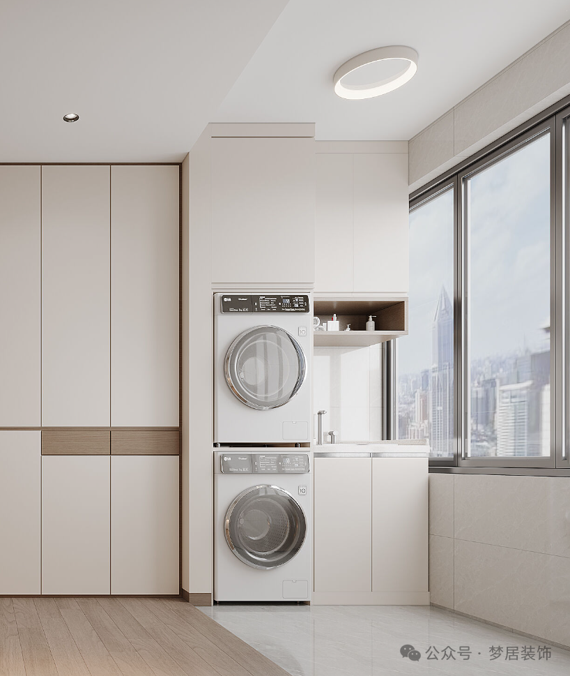 ⑤洗衣陽臺:設計家務陽臺,在陽臺的一側加建家務儲物柜,收納平時用的生活用品,另一側設置洗衣區(qū),配置洗衣套裝,滿足日常的洗衣需求。