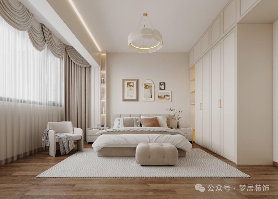 奶白色的床品與全屋調(diào)性完美契合,搭配木地板透著無限溫暖,木質(zhì)和奶白色的和諧搭配,共同營造出寧靜而愜意的休憩氛圍,給業(yè)主高品質(zhì)的松弛自在。