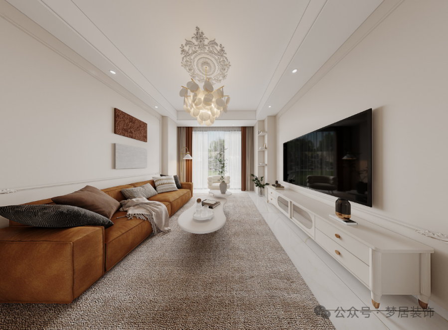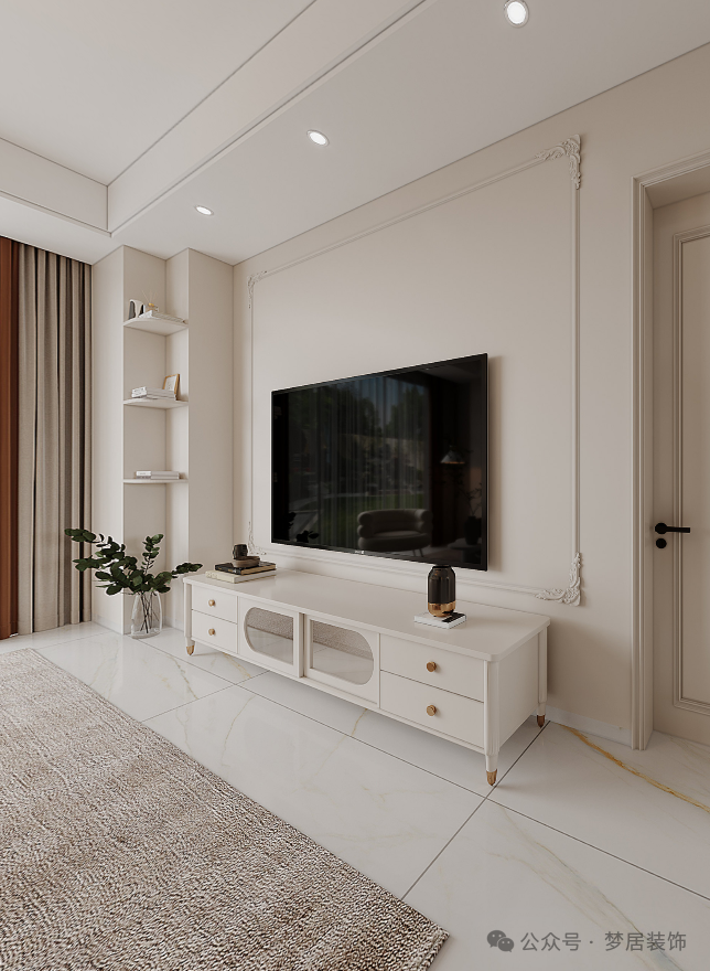 客廳電視背景墻搭配法式PU線條、雕花使整個空間調(diào)性更加柔和,視覺上也更立體、更有層次。