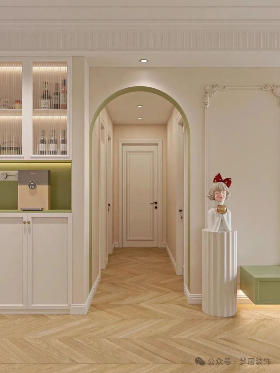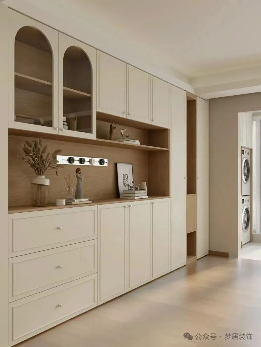 以淺色為主,適當加一點原木色,做啞光免拉手柜門,簡單高級,不要高光柜門,柜子可以加一點弧形設計更有氛圍。