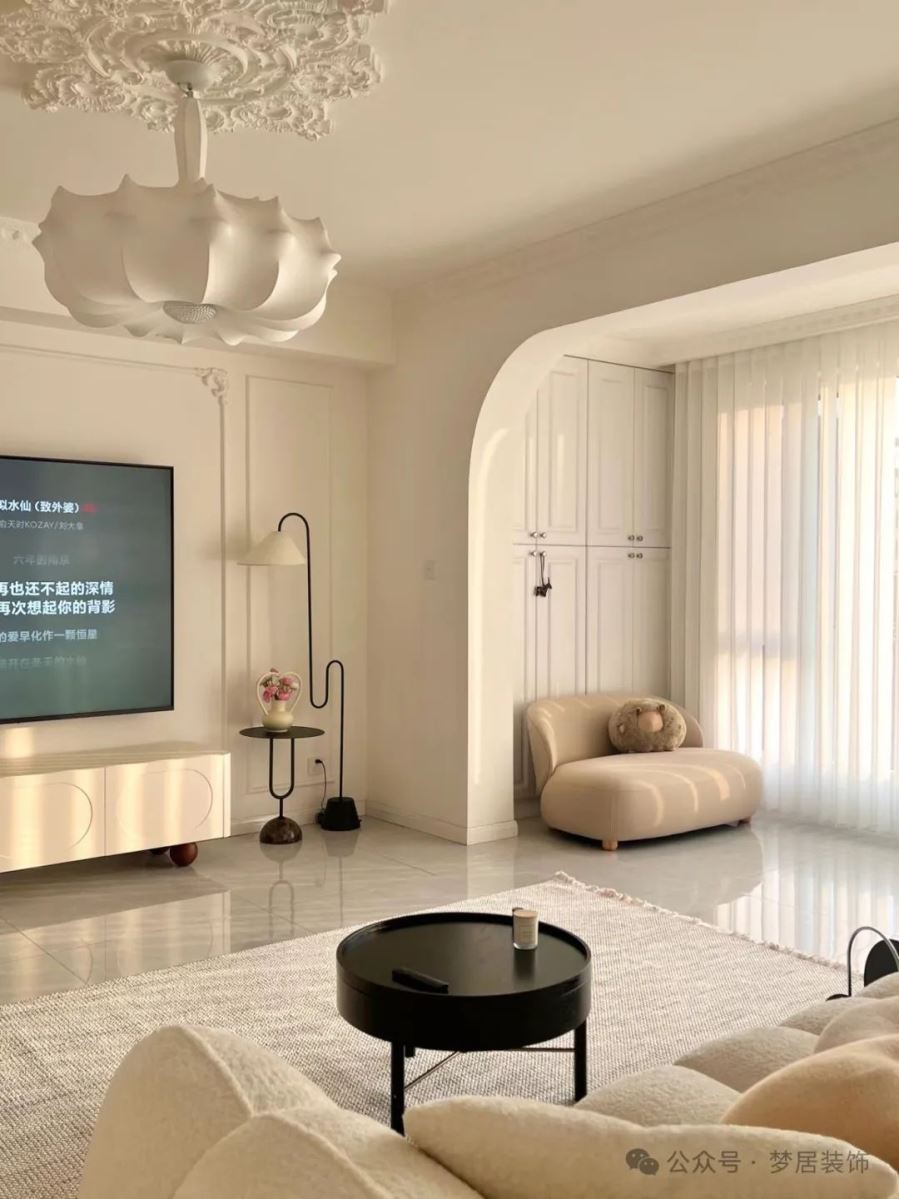 圓弧形的陽臺門、半圓形窗戶、弧形沙發(fā)都是比較常見的輕法式奶油風打造手法,使得空間變得更柔和。