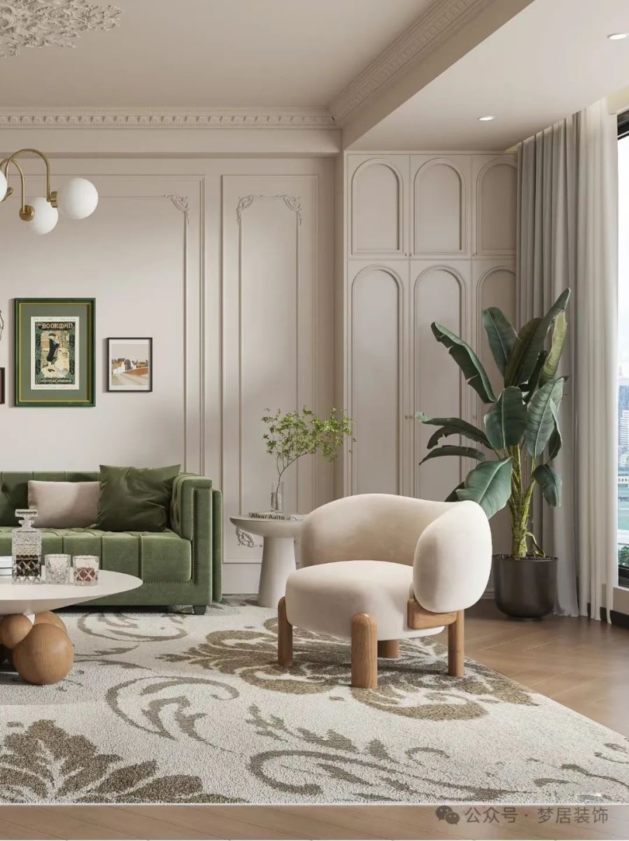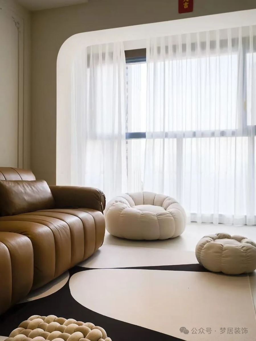 顏色選白色或復古綠、杏色、咖色,用弧形沙發(fā)、面包和云朵的造型會更有氛圍感,然后再搭配一個單椅。拒絕深色L型沙發(fā)。