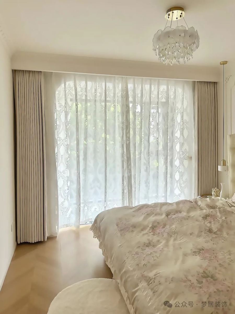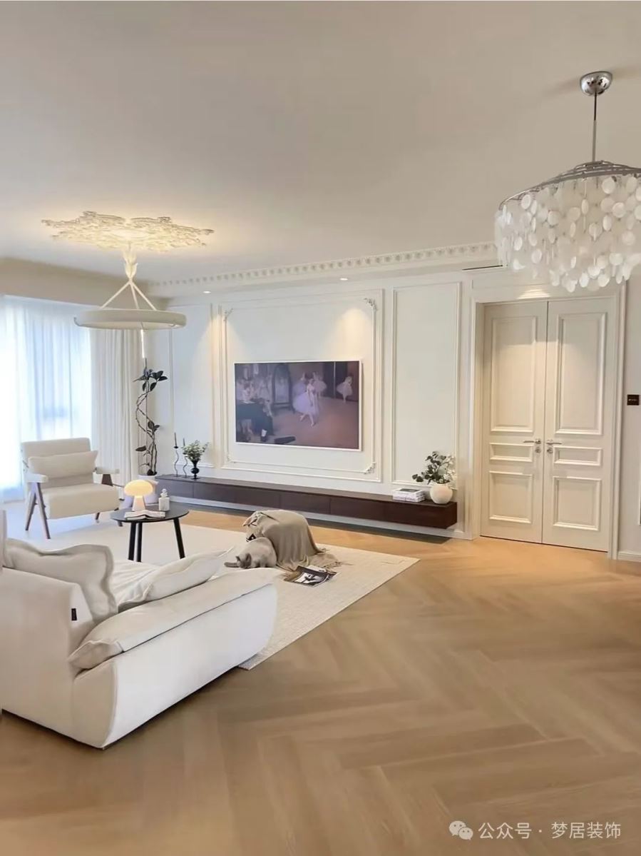 輕法式的燈光設計以氛圍感為出發(fā)點,一般會選擇暗藏燈帶和筒燈做為基礎照明,法式燈盤的主燈作為重點照明,落地燈或壁燈等進行輔助照明。