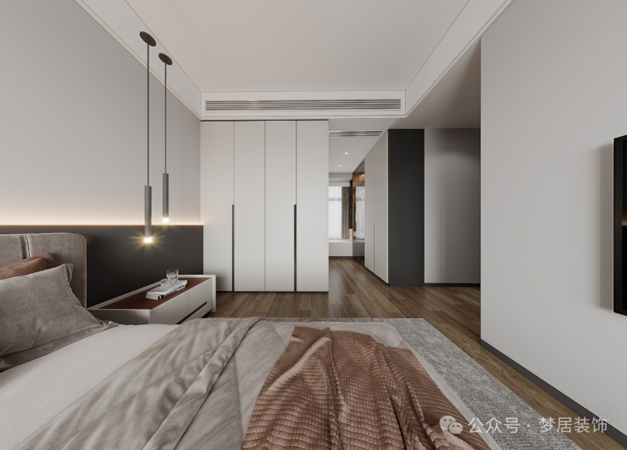 衛(wèi)生間過(guò)道較寬闊,靠近衛(wèi)生間墻面全部打上衣柜,收納功能滿分!臥室不管是功能性還是美觀性都得到滿足,有效提升居住的舒適感。