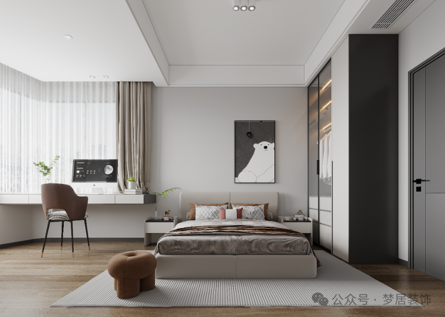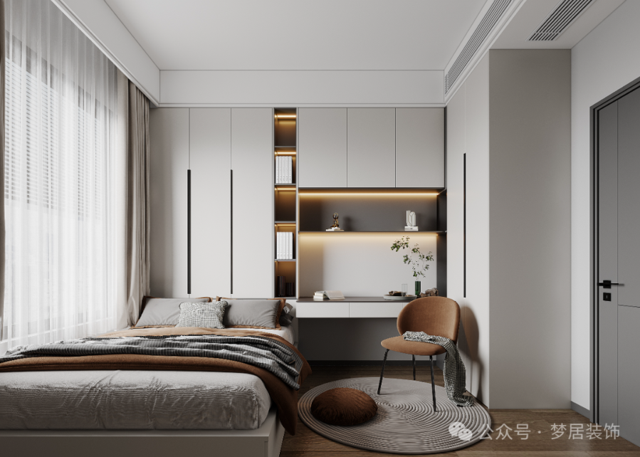 兒童房原來(lái)的陽(yáng)臺(tái)也一并并入室內(nèi)空間,打造學(xué)習(xí)區(qū)與收納區(qū)。木色與淺灰的碰撞讓臥室看起來(lái)更高級(jí)。