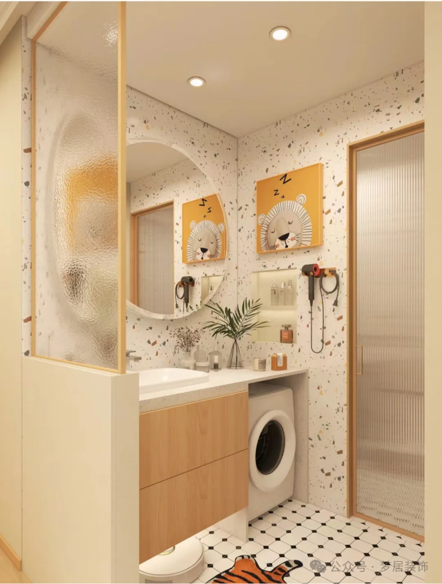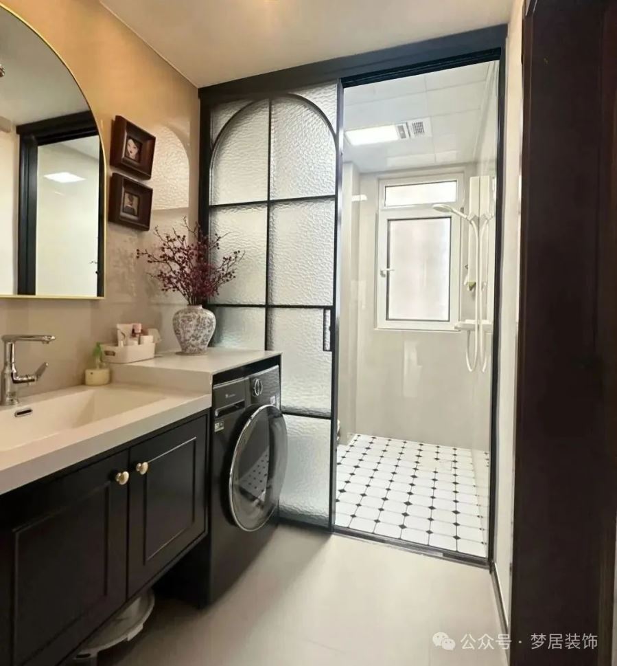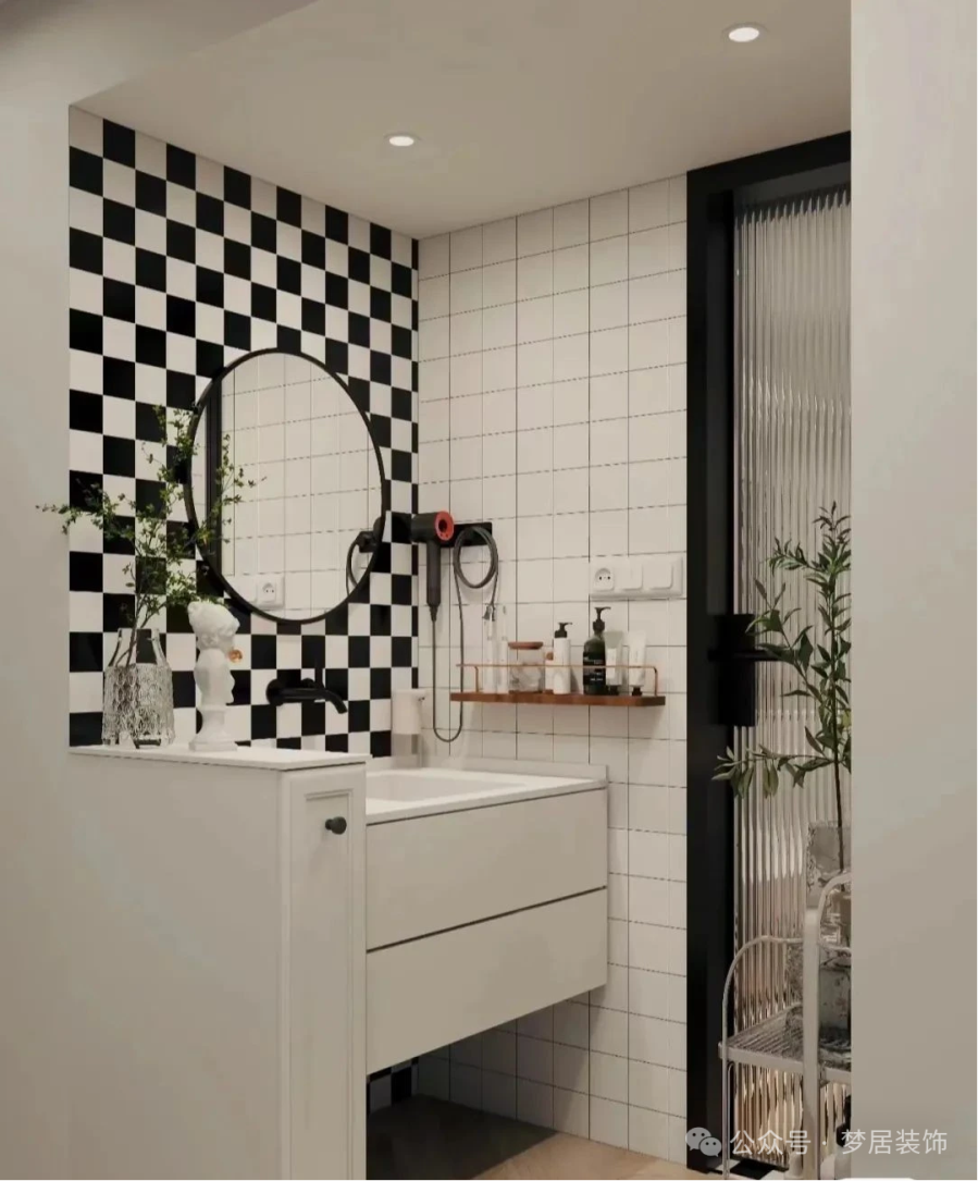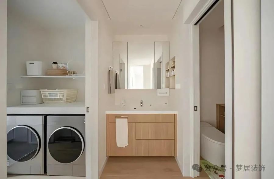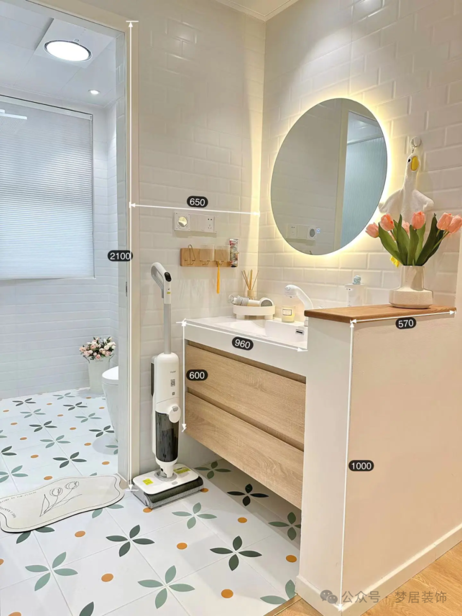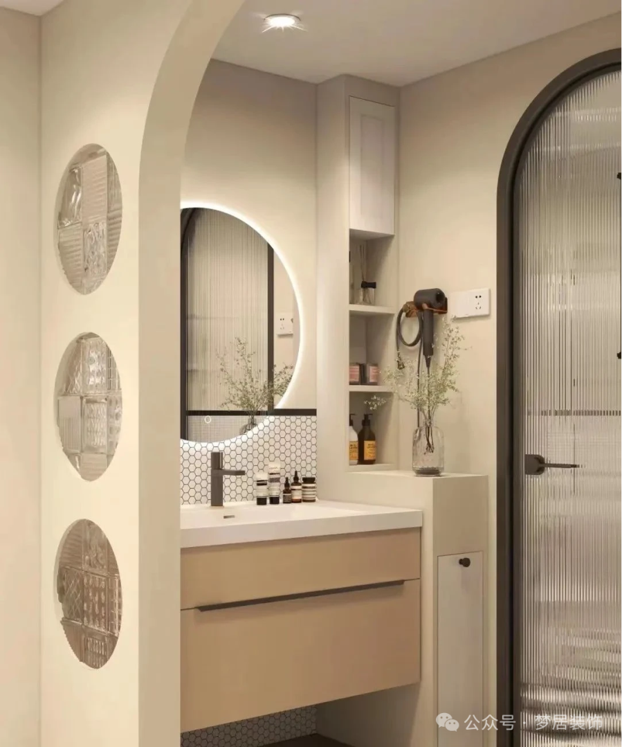 將洗手臺(tái)移到衛(wèi)生間門外后,用半墻隔斷進(jìn)行遮擋。半墻高度一般在1.0~1.2米,既能隱藏洗漱用品,又不會(huì)顯得壓抑。