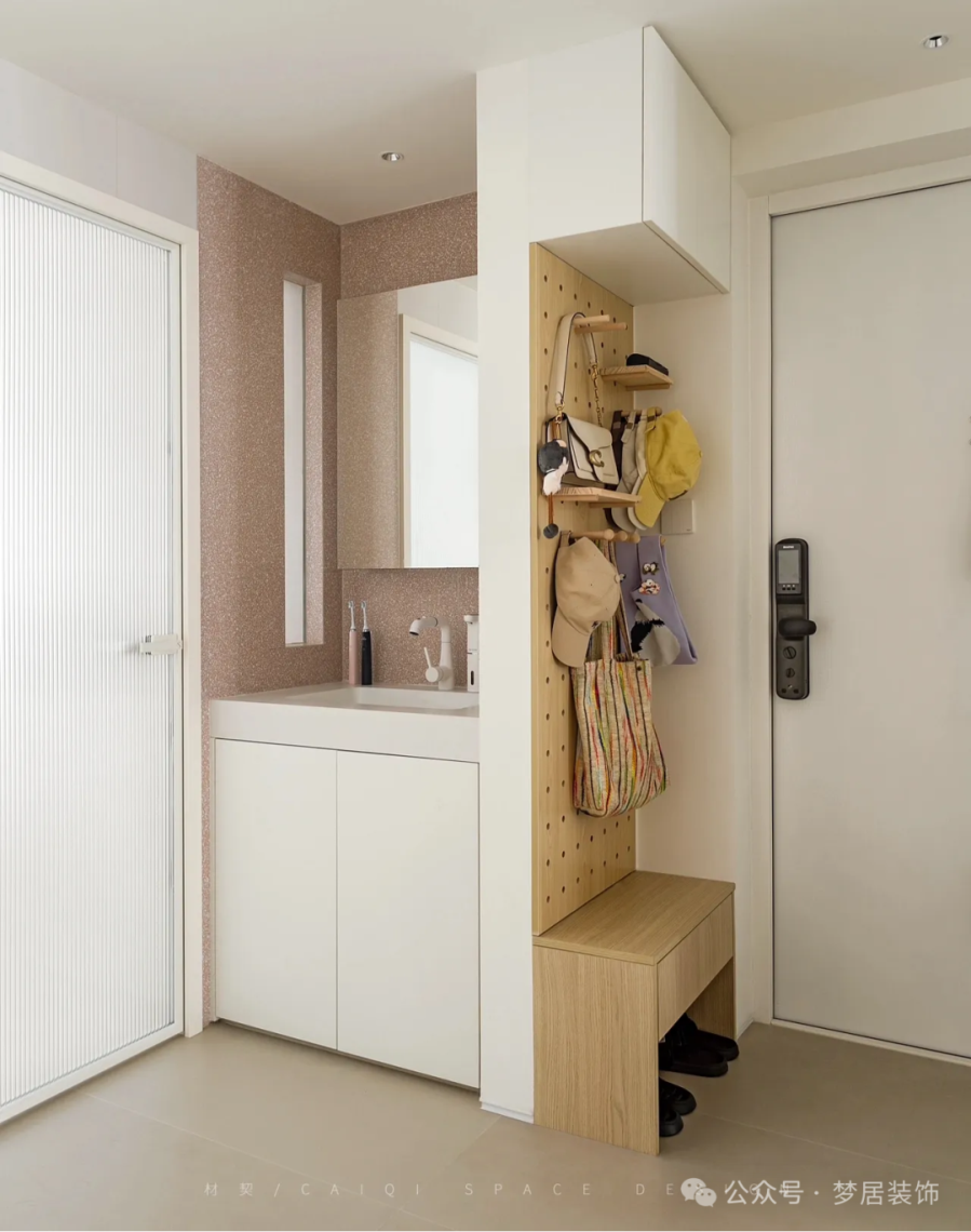 將洗手臺(tái)設(shè)計(jì)在玄關(guān)附近,回家后可以直接洗手消毒。進(jìn)門左側(cè)是換鞋凳+洞洞板+吊柜,換鞋凳可以坐下來(lái)?yè)Q鞋,洞洞板收納包包小飾品,吊柜則收納玄關(guān)的雜物。