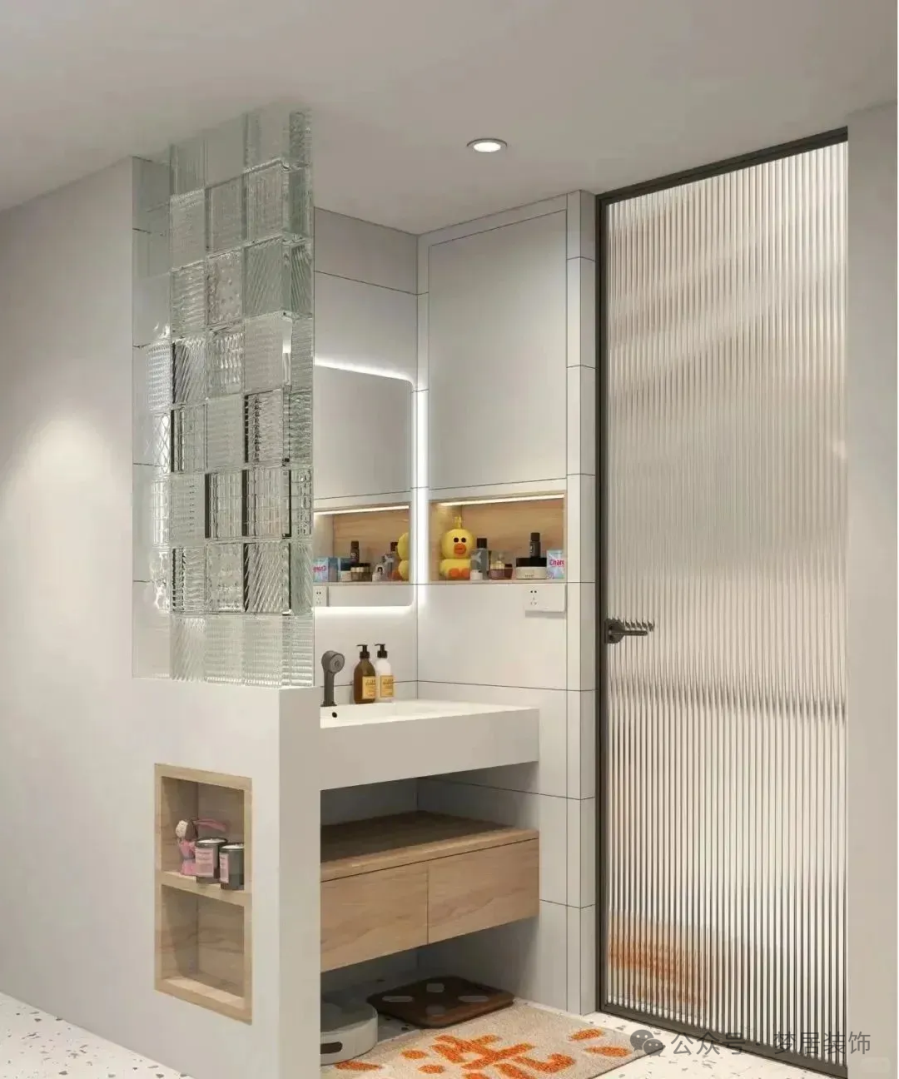 如果擔(dān)心半墻不夠美觀,可以選擇半墻+玻璃隔斷或純玻璃隔斷。長(zhǎng)虹玻璃、磨砂玻璃等材質(zhì)既透光又不透人,能有效隔斷洗手臺(tái)區(qū)域。這種設(shè)計(jì)能讓空間看起來(lái)更通透整潔。