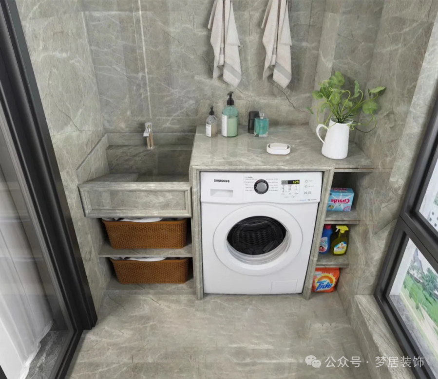 如果陽(yáng)臺(tái)面積較大,可以將洗手臺(tái)與洗衣機(jī)放在一起。這樣不僅能滿足日常洗漱需求,還能方便清洗小件衣物。陽(yáng)臺(tái)的通風(fēng)條件好,洗手臺(tái)也不容易潮濕發(fā)霉。
