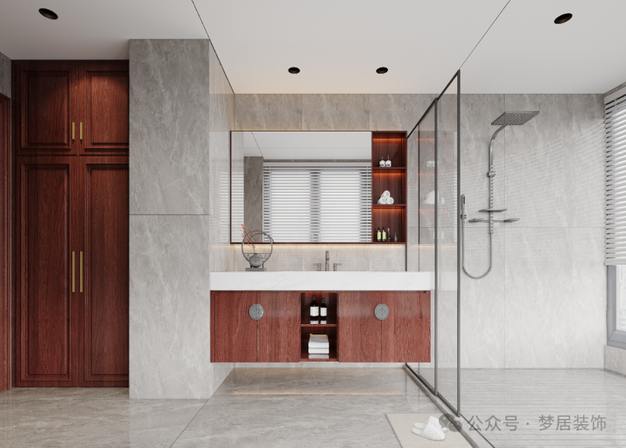 衛(wèi)生間洗手臺采用中式實木柜搭配大理石臺面,穩(wěn)固大氣,臺面擺放中式擺件,頗具韻味??臻g布局合理,干濕分離,營造出舒適、整潔且富有中式格調(diào)的衛(wèi)浴空間。