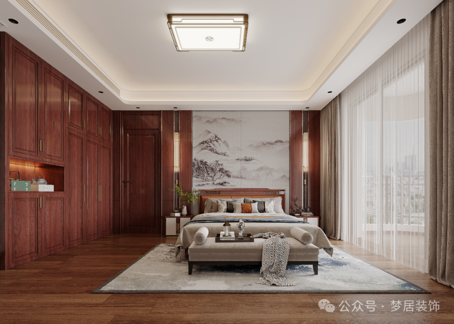 主臥中式實木床造型簡約大氣,搭配中式風(fēng)格的靠枕、床旗,舒適又美觀。背景墻的山水畫設(shè)計搭配壁燈,極具中式韻味。一層薄紗讓光線更柔和,營造舒適休憩時光。