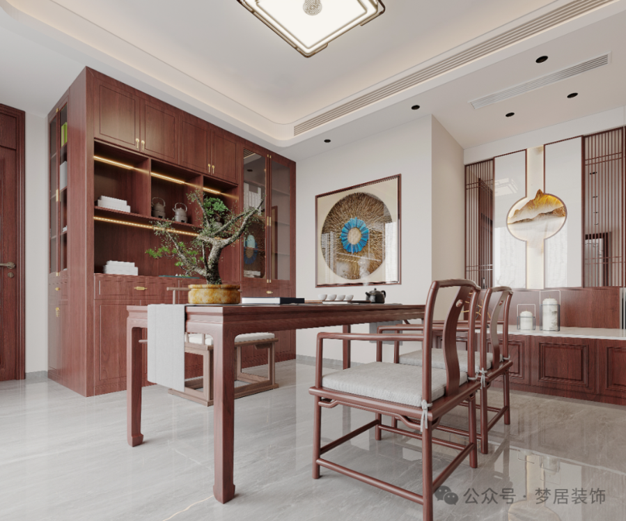 茶室一側(cè)墻面使用屏風(fēng)+半柜分隔外部空間,里面設(shè)置凳柜,空間舒適清幽,中式茶桌椅擺放整齊,有三五好友來訪聊天也非常愜意。